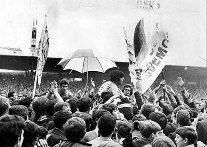Hoy en 1972 el R Oviedo empataba a uno con el Zaragoza en el viejo Tartiere y ascendia a PRIMERA. Quedo campeón de segunda división, Quique Galán "pichichi" y Lombardía "zamora". Una temporada redonda Foto: Quique Galán y Uria a hombros por los aficionados al termino del partido