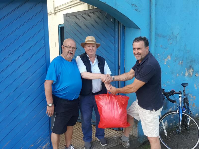 Antes del partido de los vet del Juvencia y los del R Oviedo, nuestro utillero DONATO llamo a Balán, presidente del Juvencia, y le dio una bolsa con pantalones blancos. Increible pero cierto. Foto: Partida, Donato dando la bolsa de ropa a Balán