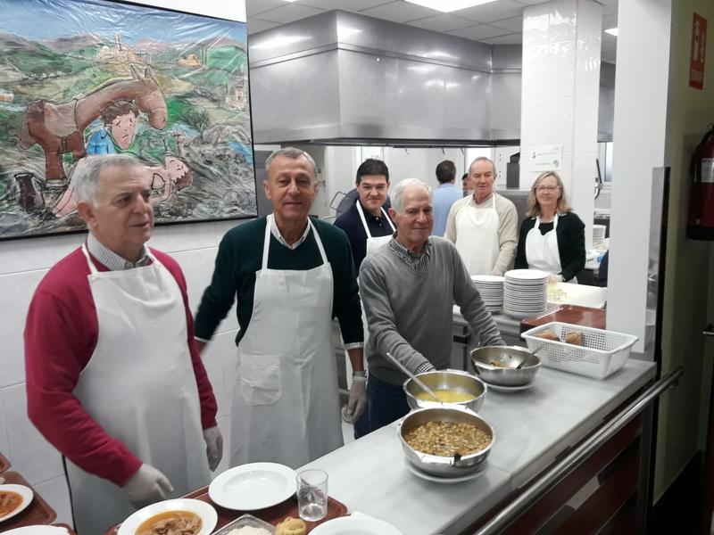 Amor, Paco Galan y Javier fueron los encargados de servir. En la foto, empezando por la izquierda, los tres y de fondo los encargados de poner las bandejas Carlos Mario, Vili y Ana