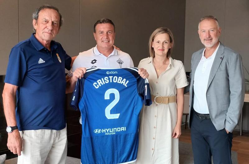 Unas horas antes del partido que enfrentó al Real Oviedo con el Racing Club de Ferrol visitamos a su Entrenador, compañero nuestro de la Asociación y Ex Jugador del Real Oviedo, Cristóbal Parralo Aguilera y le obsequiamos con una Camiseta del Club con su nombre y el dorsal que portaba durante su estancia aqui. En la Foto vemos a Mery, mujer de Janko Jankovic, Antonio Rivas, Vicente González-Villamil y Cristóbal mostrando la Camiseta.
