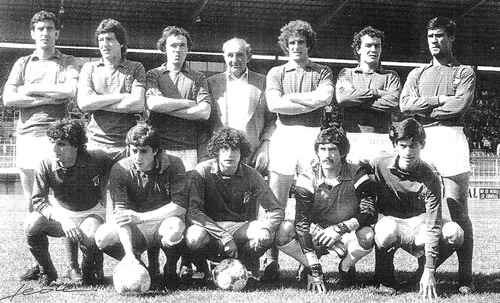 Foto: 1981, en Burgos. Jaime agachado, con gran melena, en el medio, entre Manolin y Camuel. Es el equipo de los 11 asturianos