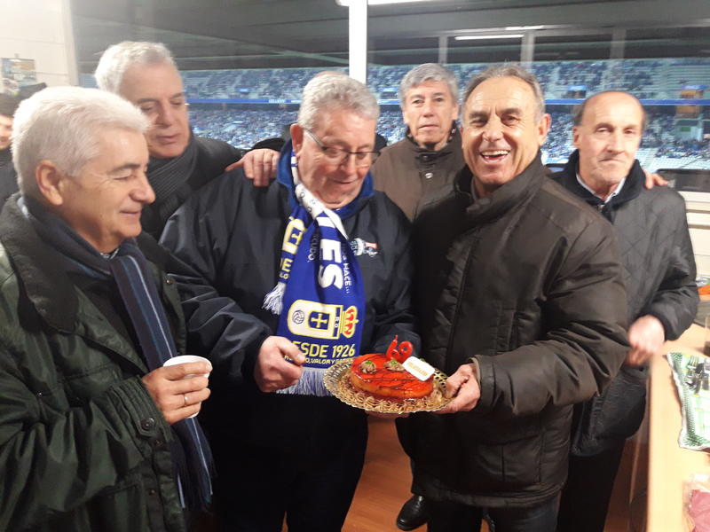 Hoy 4 del 3. El pasado viernes, en el descanso del partido del R Oviedo, sorprendimos a nuestro compañero Joaquín Cabrera  Peláez "QUINI", con una tarta, ya que el pasado día uno cumplió 69 años. Conseguimos sorprenderle y emocionarlo