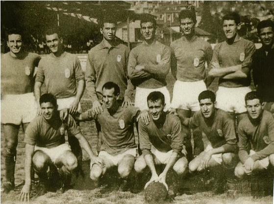 FOTO: TEMPORADA 1962-63; Toni, Marigil, Boudón, Iguaran, Alsrcon, Paquito y Caldentey. Agachados: Hermes González, Sanchez Laga, Artabe, ALCORTA e Izata