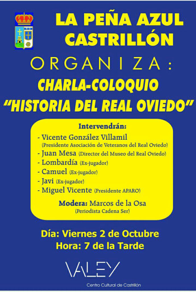 Hoy 29 del 9. El proximo viernes, día 2, a las 19h, en el Centro Cultural Valey, de Piedras Blancas, la Peña Azul de Castrillón, organiza una charla sobre el R Oviedo, donde el moderador será Marcos de la Osa y acudiran los veteranos, Mesa, Lombardía, Camuel, Javi y Vicente