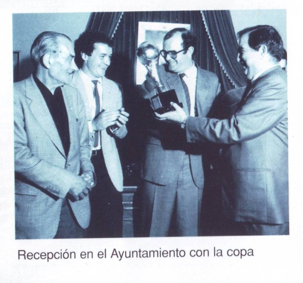 Foto: Bango, entregando la Copa de la Liga al Ayuntamiento de Oviedo. Empezando por la izquierda, Herrerita (simbolo del oviedismo), Vili (capitán), Masip (alcalde) y Bango (presidente)