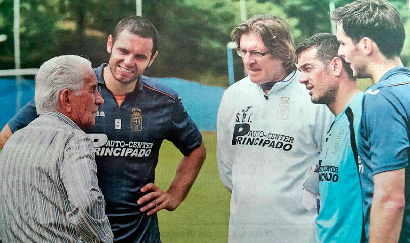 Hoy 5 del 6. Ayer bajaron al entrenamiento del R Oviedo nuestros presidentes, Toni y Vicente. Para que nuestro Presidente de Honor, Toni Cuervo, leyenda viva del R Oviedo, hablara con los jugadores y cuerpo técnico. Toni chraló con los capitanes, Esteban, Cervero y David y con el entrenador, Sergio Egea. Lo que más se impactó fue el terreno de juego, mucho mejor que cualquier campo de los que jugo él jugó, durante 17 temporadas en el R Oviedo. Les dijo "GRACIAS POR SACARNOS DE AHÍ" y que estaba seguro que esto seguiria para arriba. Comentó las grandes diferencias de cuando él jugaba y que hoy cualquier jugador tiene una CUCHARA en el pie para manejar el balón