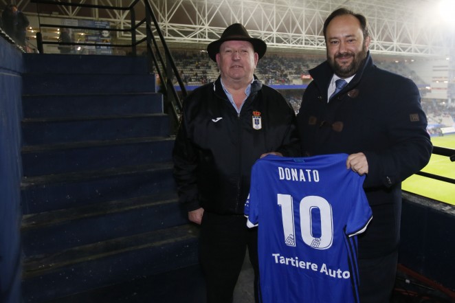 Hoy 27 del 3. El sábado pasado, día 25, en el descanso del partido R Oviedo-Girona, el R Oviedo rindió un merecido homenaje a uno de sus grandes empleados, el utillero D. DONATO Aumente Feito. El presidente entregó una camiseta con su nombre y el nº 10.