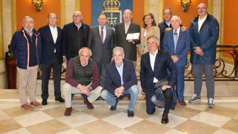 En la foto vemos a Marcos Pons acompañado de varios de los promotores del Homenaje entre los que se encuentra nuestro Presidente Vicente González Villamil y al Alcalde de Oviedo D. Alfredo Canteli que le hizo entrega de una Placa en reconocimiento a su trayectoria y labor en el deporte como "Maestro" de formadores y tecnicos.