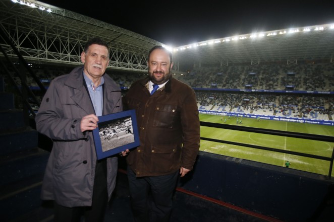 Hoy 14 del 12. El pasado domingo en el descanso del partido del R Oviedo el presidente del club, Jorge Menéndez Vallina entregó a José Luis QUIROS una foto de cuando jugaba en el equipo carbayón