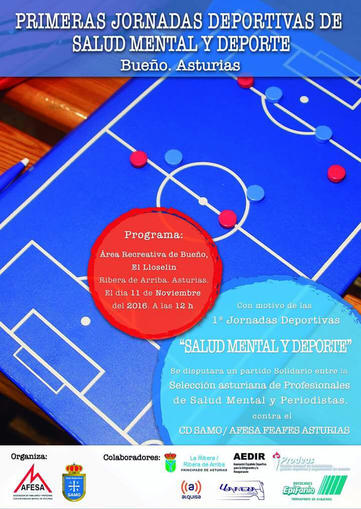 Hoy 4 del 11. El proximo viernes, día 11, a las 12h, en Bueño, se celebran las PRIMERAS JORNADAS DEPORTIVAS DE SALUD MENTAL Y DEPORTE, con este motivo se disputará un partido Solidario entre la Selección asturiana de Profesionales de Salud Mental y Periodistas contra el CD SAMO/ AFESA FEAFES ASTURIAS.