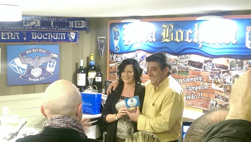 Hhoy 17 del 3. El pasado martes, día 15, a las 20h, la Peña Azul Bochum, celebró su fiesta anual, en el bar Garnacha, entregando su III Memorial Victor Mesa, a SILVINO, utillero del R Oviedo. El galardón se lo entrego Cristina, presidenta de la peña. También le puso el ,pin de la Peña, a nustro presidente Vicente. Acto muy concurrido, entre ellos Carlos y su família, muy buen ambiente y magnifico pincheo. Este año la Peña cumplirá sus 30 años, que es una de las más antiguas