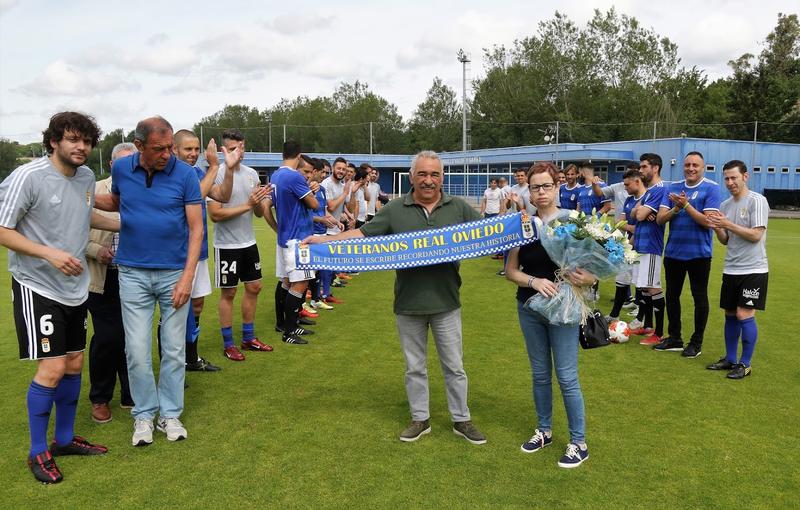 El sábado ayudamos a la organización del partido del reencuentro en el Requexón. Nuestro presidente se puso a disposición de los organizadores del partido, Cervero y Jon Carrera, para lo que necesitasen. Les dejamos la ropa y les obsequiamos, a cada uno, con una insignia del R Oviedo. A los padres de Armando Barbón, Blanca y Balta les regalamos una bufanda de la Asociación