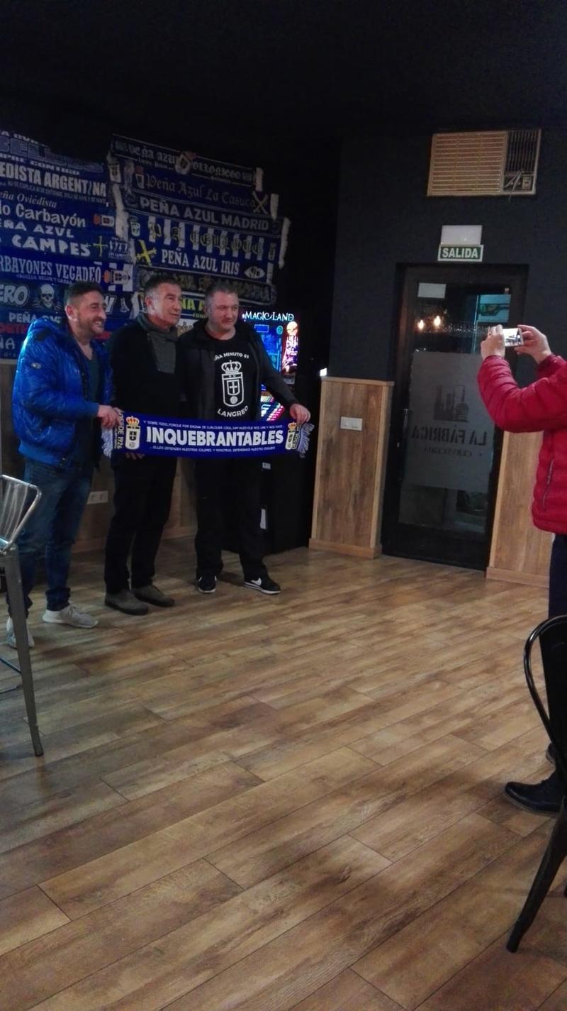 El pasado viernes Manuel Vicente fue a la sede de la Peña Minuto 51, de Sama de Langreo, a ver el partido del R Oviedo y les obsequio con una bufanda de los Veteranos