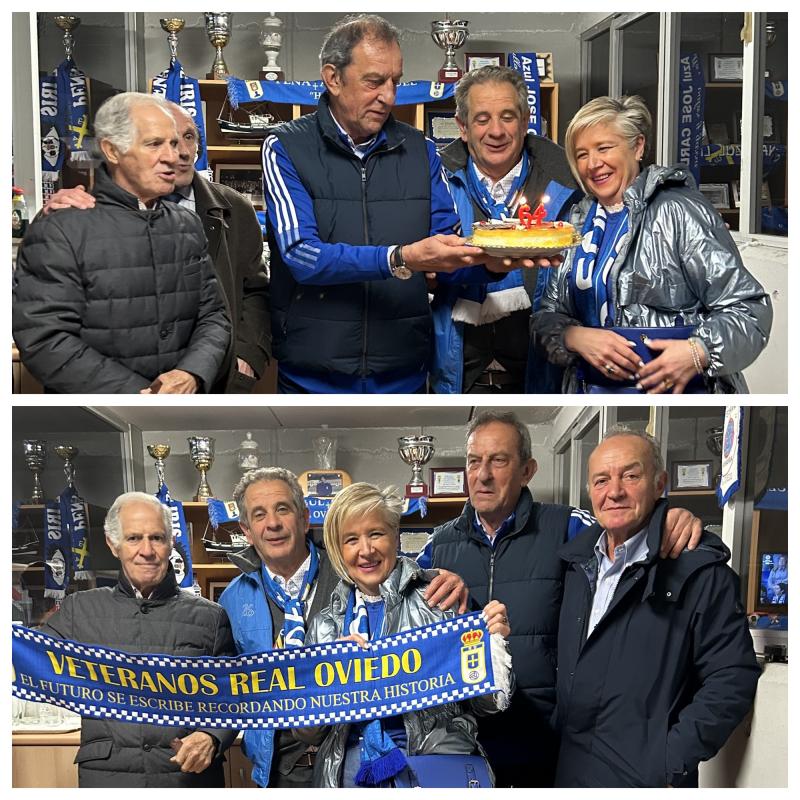 El pasado sabado día 1 de abril nos acompañaron en el Palco que la Asociación disfruta en el Estadio Carlos Tartiere, Francisco "TRELLES" que cumplía 64 años y su mujer Ana; en las imagenes les vemos soplando las velas de la Tarta y con una Bufanda de los Veteranos acompañados de varios de nuestros compañeros.