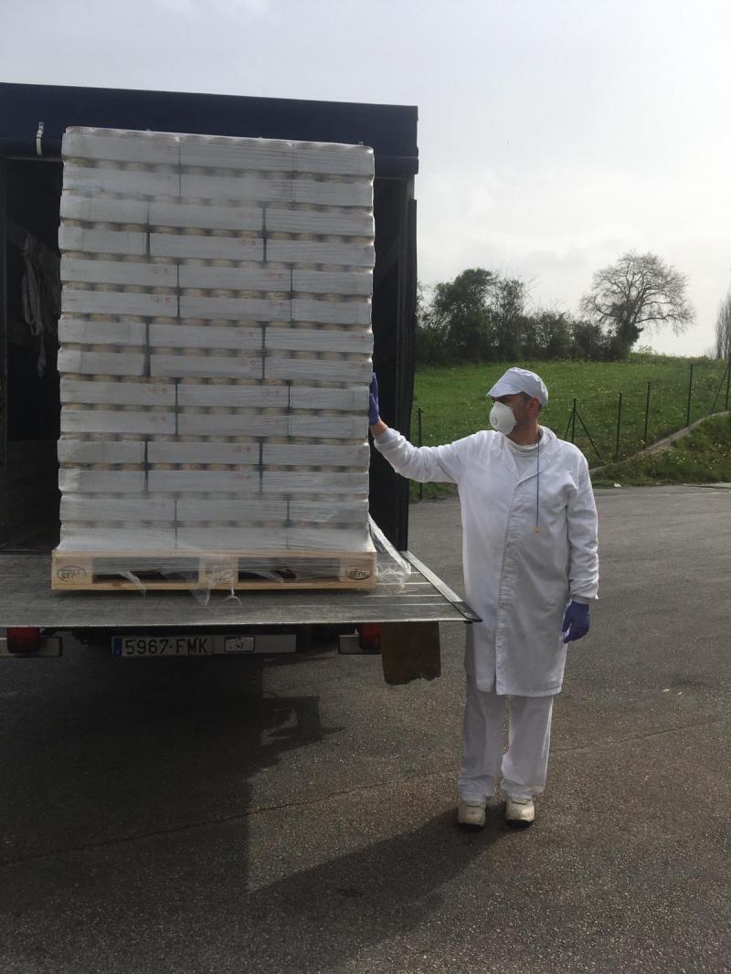 Ayer, 20 del 3, mandamos a un trasportista a La Noreñense para que cargara dos pales de latas de callos, que nos dona LA NOREÑENSE, con direccción la Cocina Económica. Pepin ayuda a cargar los pales