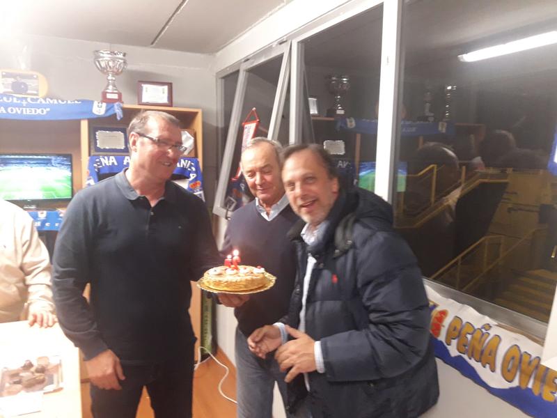 Ayer, en el descanso del partido R Oviedo-Almeria, Tomas y Vili, dos históricos, le hicieron soplar a Rafa, las velas por su cumpleaños. La asociación le regaló una bufanda