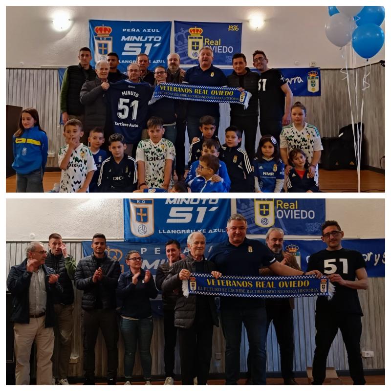 La Peña Azul Minuto 51 celebró en el día de ayer su septimo aniversario; al acto acudieron, Manuel Paredes, Carlos Muñoz, Miguel Sanz y los jugadores Abel Bretones y Charbel Wehbe por parte del Real Oviedo, Maria Joglar, Presidenta de Peñas Azules y nuestros compañeros Vicente González y Javier Álvarez representando a la Asociación de Veteranos a los que vemos en las fotografias con Damián, Presidente de la Peña y otros miembros de la misma