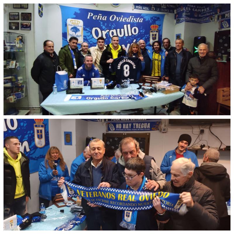 En las fotos vemos a los asistentes al acto con Isa, Presidenta de la Peña, varios miembros de la misma, Rodri Tarín, Alex Cardero, Carlos Muñoz y Miguel Sanz por parte del Real Oviedo, Alvaro de la Aparo y nuestros compañeros.